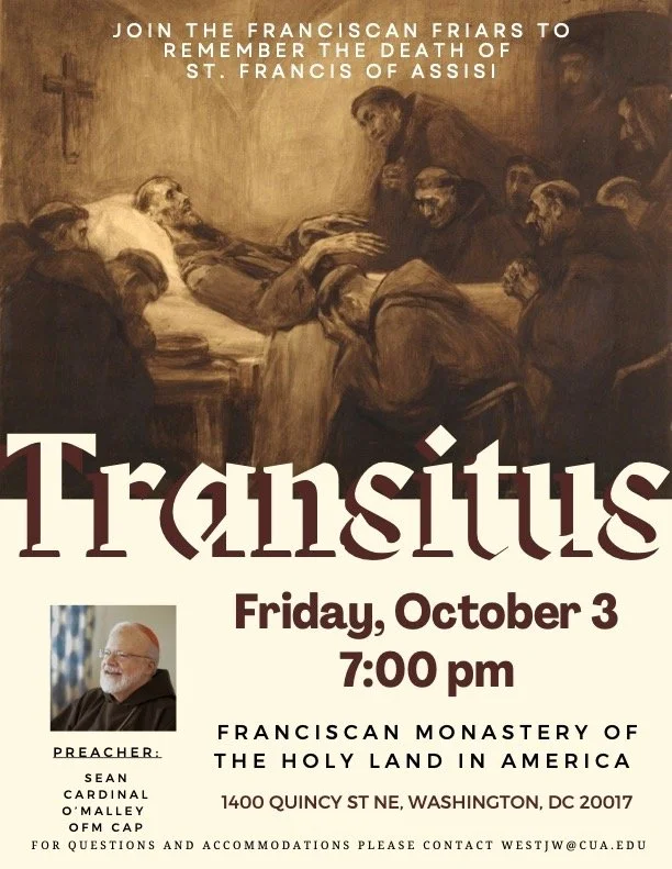The Transitus is a commemoration of the Passing from this life into Eternal Life of St. Francis of Assisi. It takes place as an evening vigil where we reflect on the life and example of Our Founder and seek to prepare ourselves for His Feast Day. All are invited to attend with the Franciscans from around the DMV area!